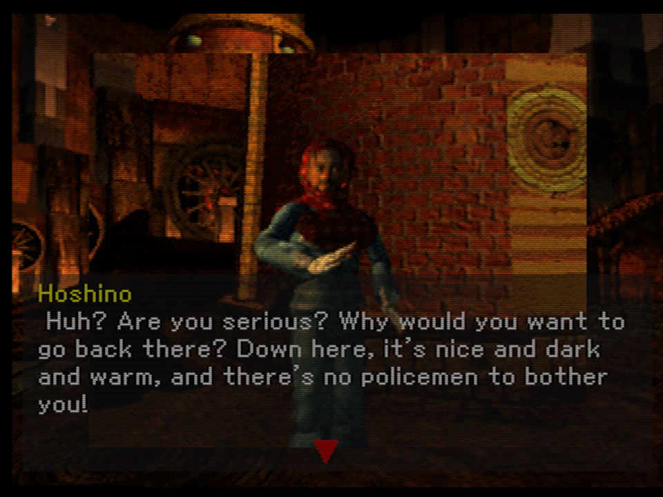 Now, if you're like me, that concept sounds cool as shit. A game that combines horror with slight Cyberpunk/Kowloon Walled City elements and has the visual gestalt of the games in the back of Gamefan magazine that I would fantasize about playing as a kid. And like I said, it's good. But the problems come in when you realize that the Mesh is not as fleshed out as it should be for a game like this. NPCs don't really do much or have a whole lot of character beyond saying a couple of goofy lines, giving/receiving items, or getting killed. The Mesh itself is mostly a series of dark corridors with generic, unmarked doors leading you to the characters, or to completely empty rooms. I felt that there should have been better care taken with the narrative structure of the game.