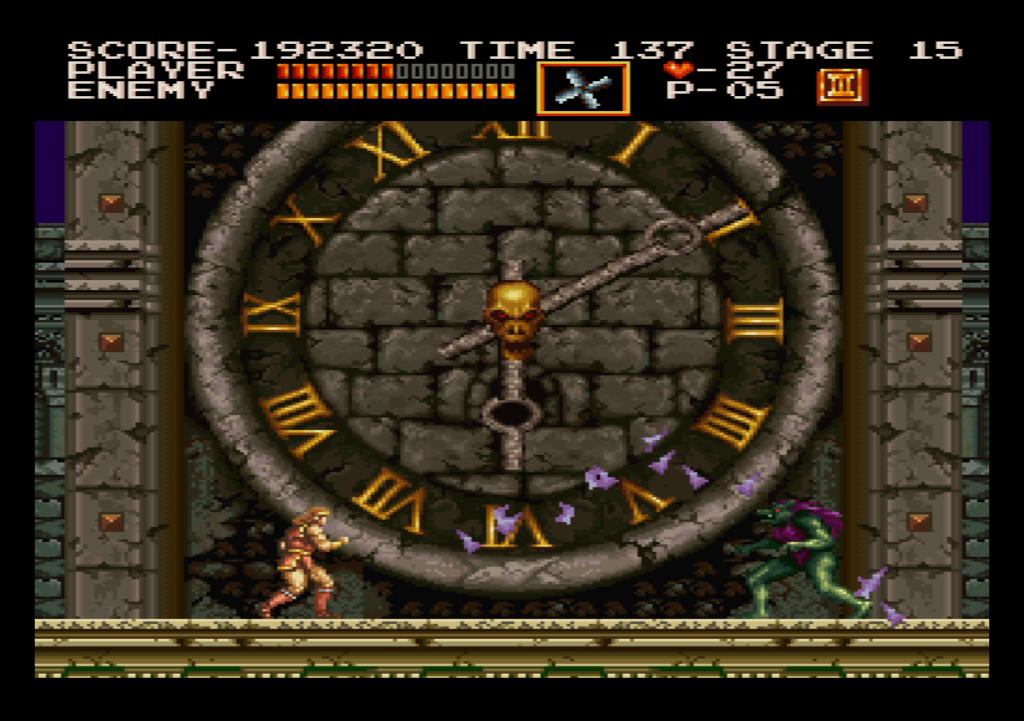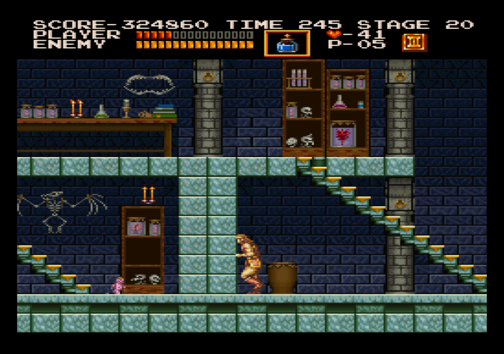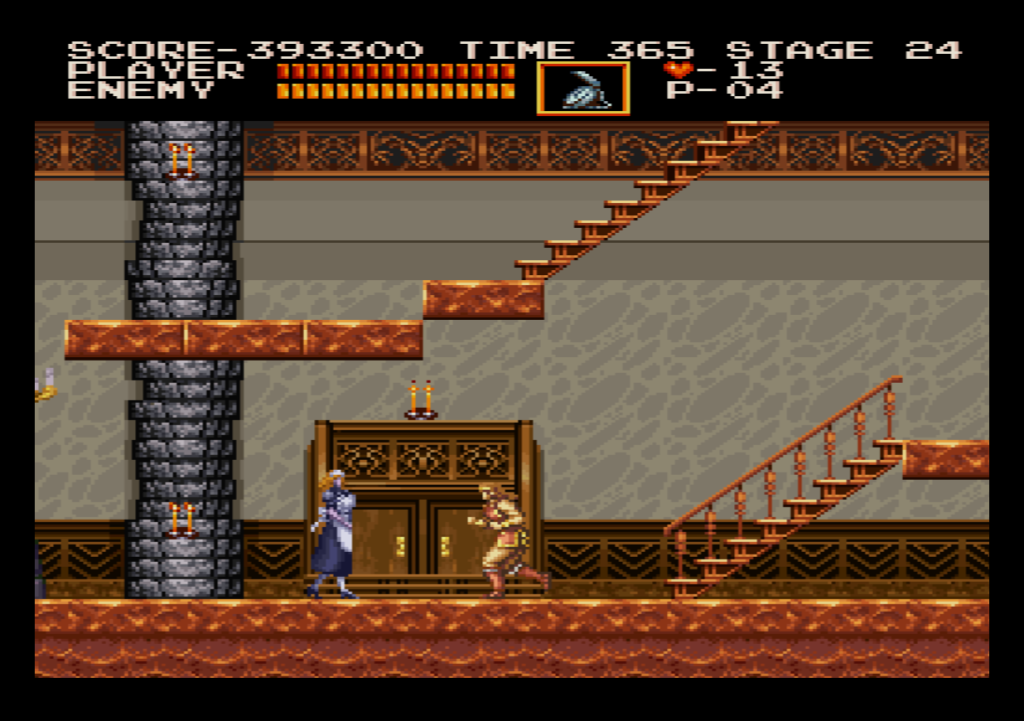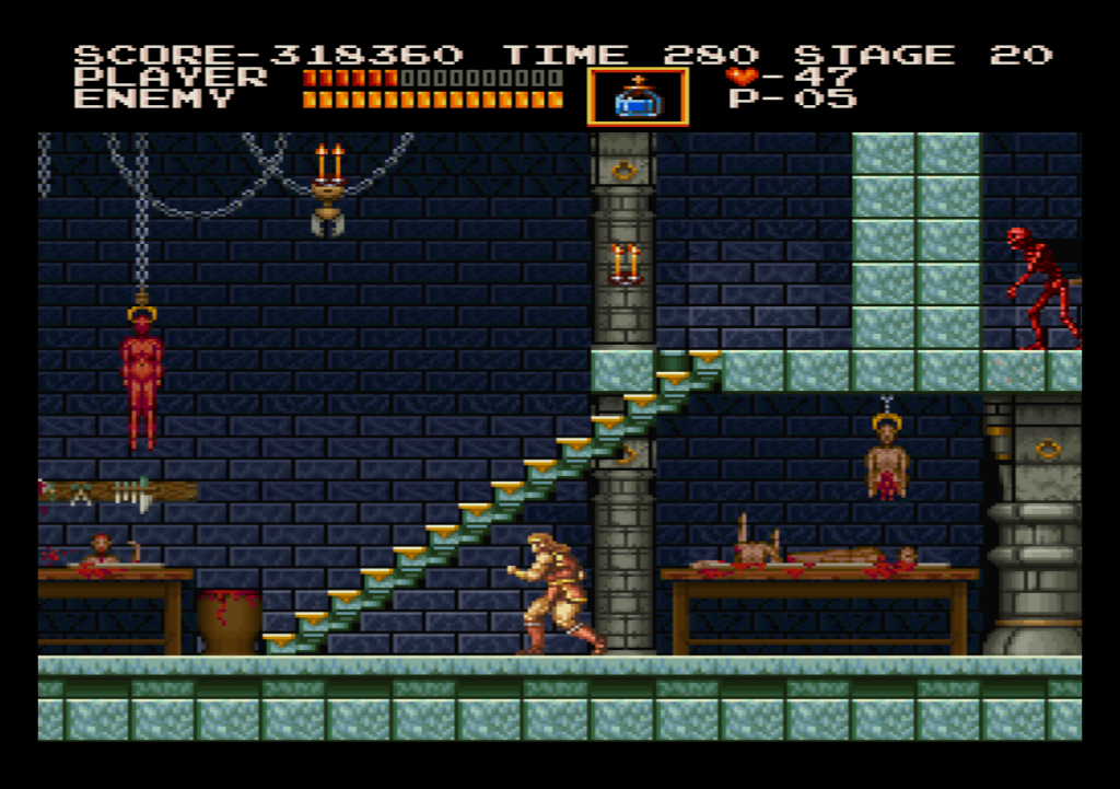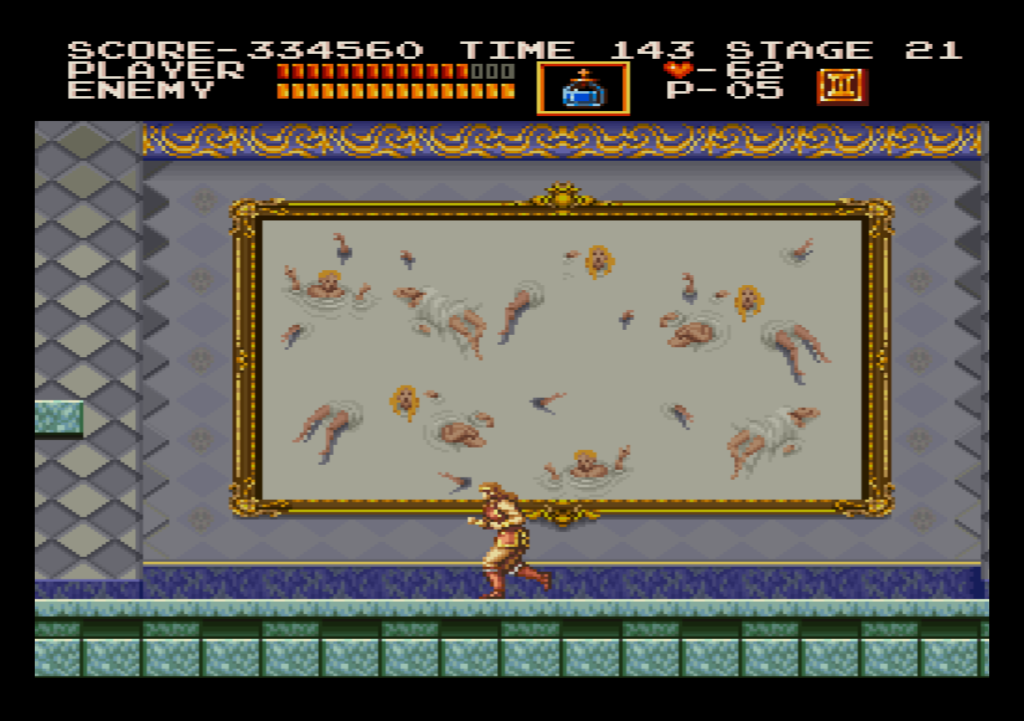 As I said earlier, Dracula x68k is a remake of the original Castlevania. It has some new enemies, two new levels, some slight layout changes, and Simon can whip downward while in the air. Other than that, it's still Castlevania 1. The castle entrance is the exact same as it is in every subsequent CV, and you fight a giant bat at the end. You fight Medusa, Frankenstein's Monster, Death, then Dracula himself. The mummy, Akmodan, is gone. In his place is a clone of Simon that bursts through a mirror. New bosses are a dragon skeleton, a wizard, and a werewolf. I think it's a much cooler line-up, personally. The remake comes across as less hokey than the original, with the new bosses and the new art style, which is awesome. Monsters look more gruesome and the architecture is more detailed, which I appreciate. But where the art truly shines is in the remade level where you fight the Grim Reaper. It is the most gory, edgelord level, and I fucking love it. Dismembered and flayed bodies hanging on hooks with blood and guts all over the place. Babies bursting out of formaldehyde jars to attack you. Still-living humans trapped in a sentient paint canvas. It is so cool, like something out of a torture porn movie.