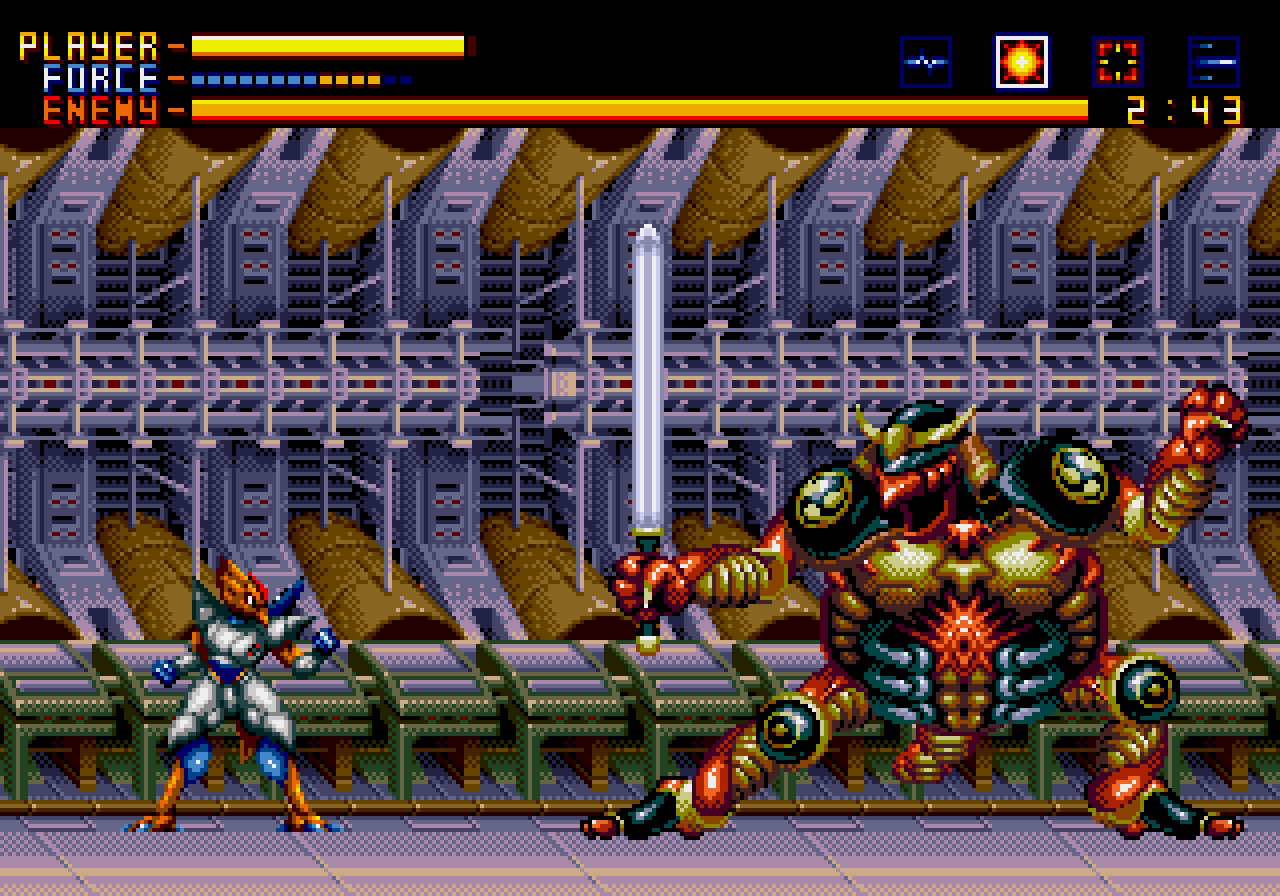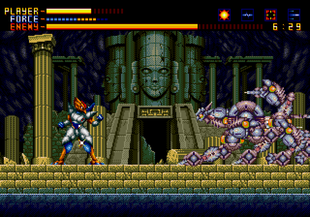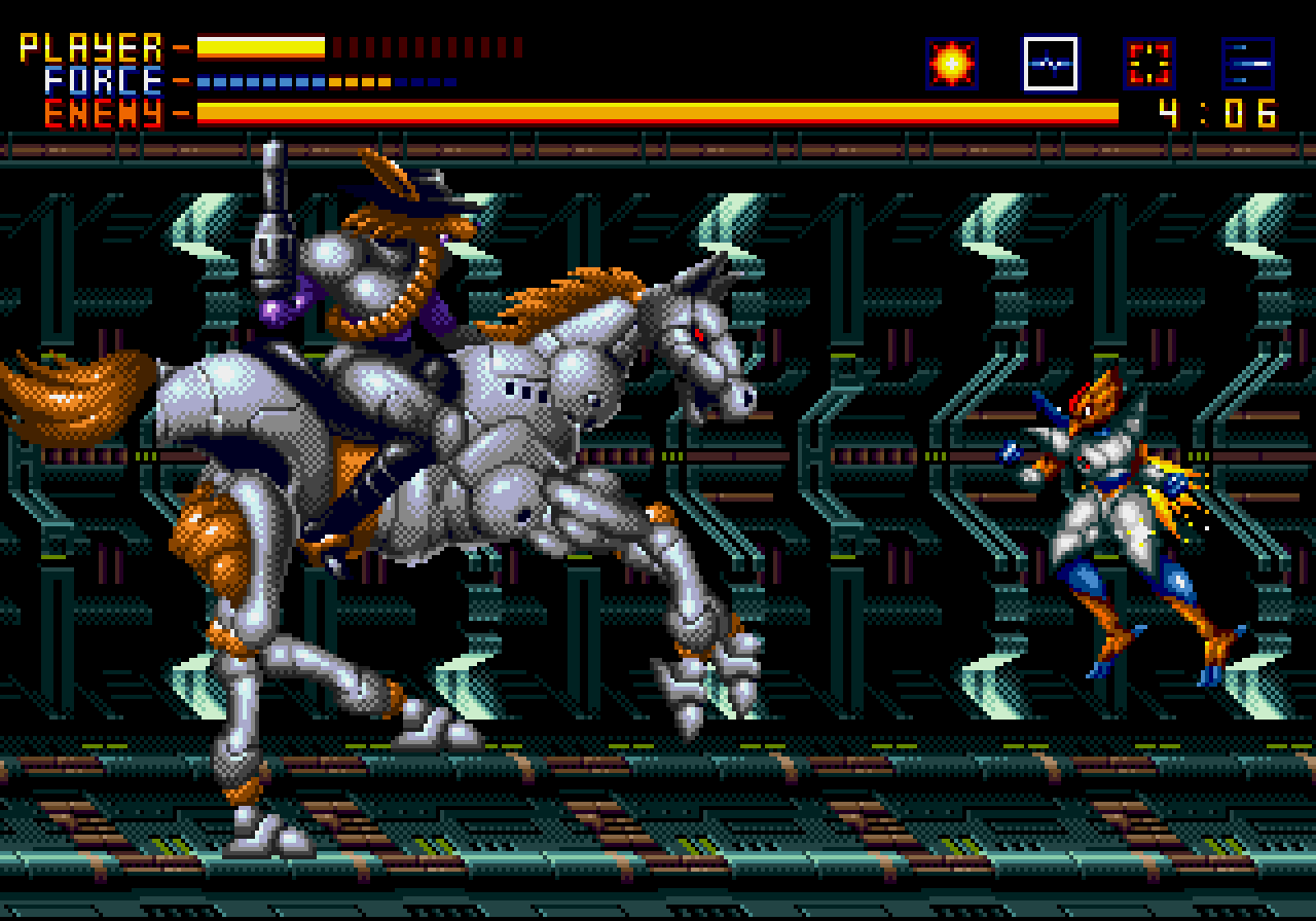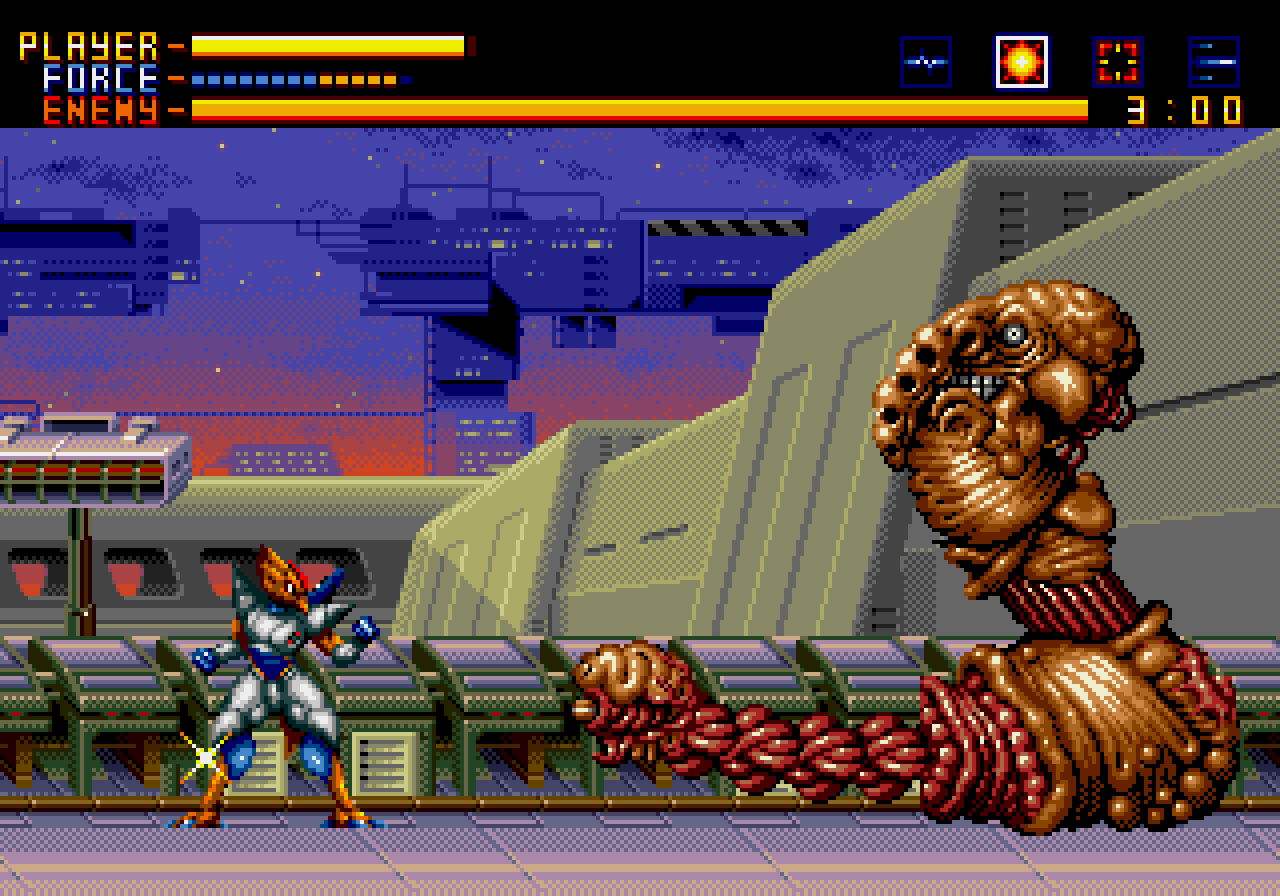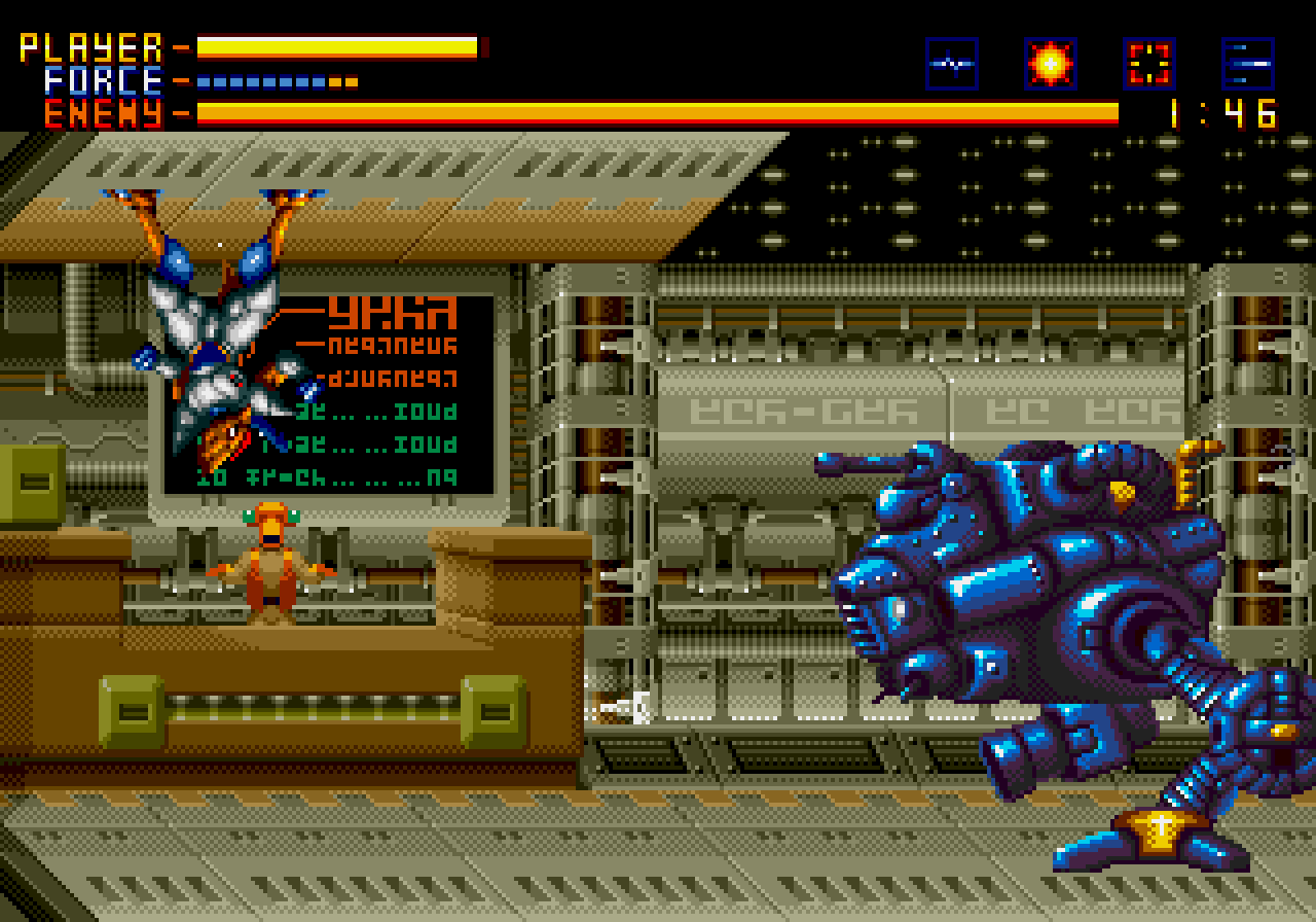 With all of that out of the way, I should probably talk about the game now. Alien Soldier is another stone cold classic from Treasure, a company that has made the best games of all time, and also Bangai-O HD for the XBox 360. It's a game where everything explodes, everything is loud, bordering on sensory overload at times. You run forward and shoot, fighting a whole lot of bosses along the way. And I do mean a lot of bosses. Unlike other games like Gunstar Heroes, or Contra: Hard Corps, which had levels and enemy formations and stuff, Alien Soldier is all bosses, broken up by a single hallway full of weapon power-ups and small enemies that drop health refills when killed, before going right back to another loud, flashy boss fight that kicks ass. This gauntlet of large monsters, one after another, each with their own unique look and attack patterns. There are over 20 bosses in this game, not a single one is a palette swap, which is really fucking impressive. And they all look really unique! Some of them are these unholy unions of insects and cybernetics. Or small animals and cybernetics. Cronenberg-esque body horror. A lobster dressed as a shogun. A werewolf cowboy riding a robot horse. A lot of cool shit.