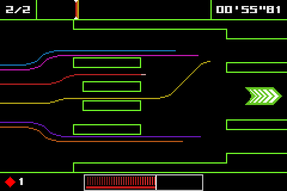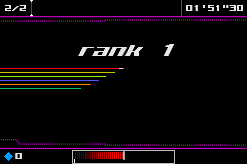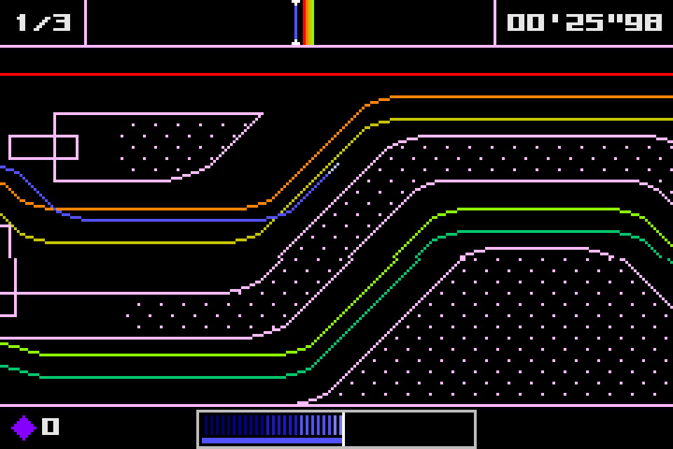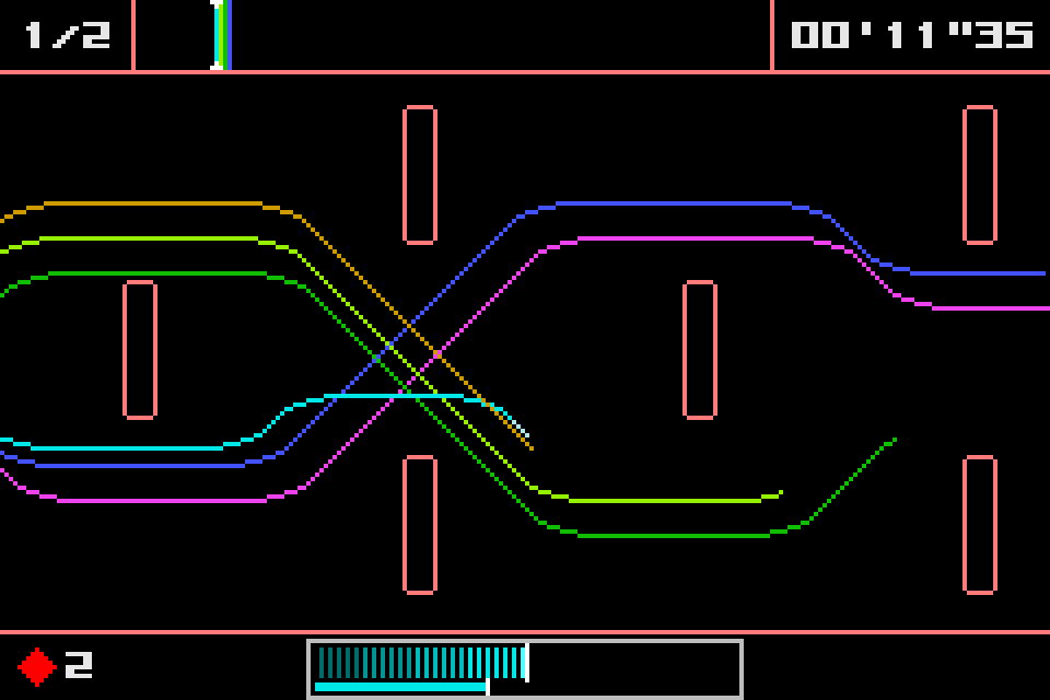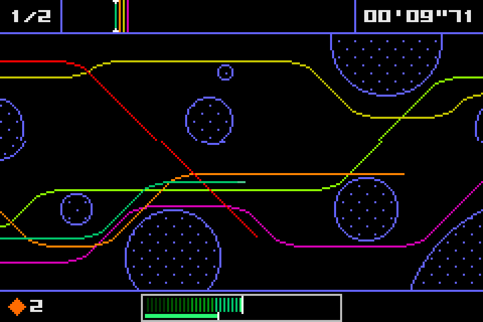 Dotstream is one of the games that are part of the Bit Generations series, along with games like Orbital. It's a horizontally scrolling racing game where instead of a car, you are one of many different colored lines of pixels. Think of the light cycles from Tron, but they have more freedom of movement than 90 degrees and you don't explode if you crash. However, instead of the normal acceleration and braking that comes from a racing game, your main form of acceleration is done through slipstreaming the other lines on the track, hence the name Dotstream. There's a brake, but I have never actually used it in all the years I've been loading this game up on the GBA. You spend each race not just trying to get in first place, but avoiding the walls and moving obstacles so as not to crash, since that takes away from a limited resource you have (represented by flashing diamonds), which can also be used to give yourself a short speed boost. This is the risk/reward part of the game; you could use your boosts and get an early lead, but then risk immediately losing a race if you crash. You don't get to retry a race either, if you fail, you immediately retire with zero points and go on to the next race. It is also possible to get new diamonds by entering the pit lane at the starting line, but you of course are stuck in place while getting these diamonds and don't have the luxury of more than two or three laps to catch up to anyone that passes you. These are all short races where you are meant to memorize the tracks and manage yourself and your resources accordingly. It's a pretty short game (I mean, it's on a handheld), and it gets very difficult towards the end, but it rules and is really fun to play.