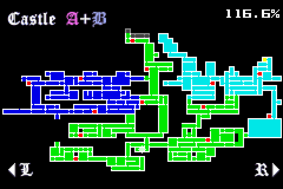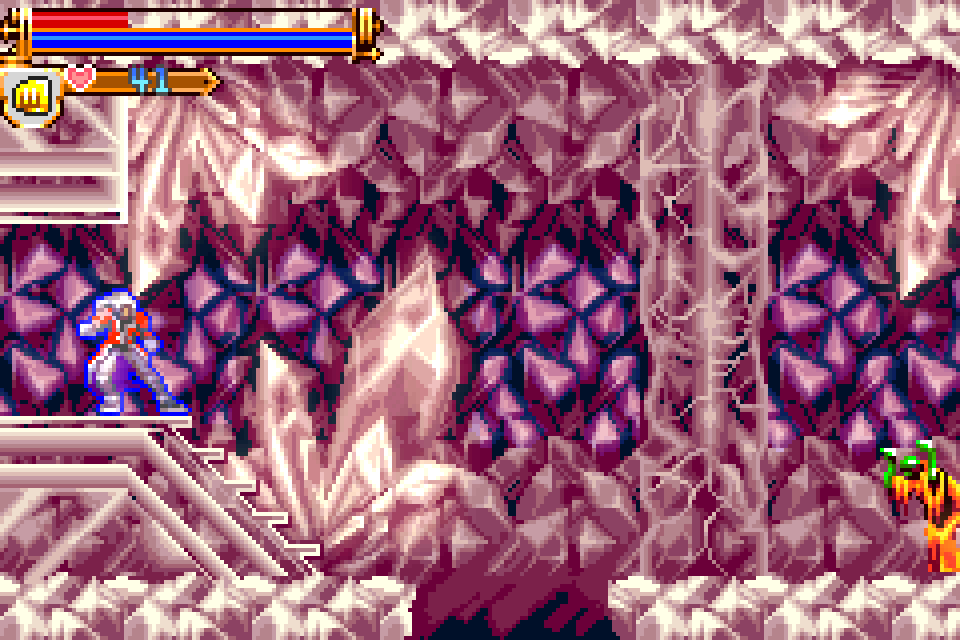 This is not the case here. Harmony of Dissonance lives up to its name, with a layout that makes the player wonder if they had accidentally loaded up a ROM with a randomizer included. Sense and coherence are out the window here. You move from room to room with ever-changing themes, even within the same area of the castle. For example, there is a room, a standard medieval castle affair, that leads to two exits. One exit takes you to a room full of lava with an active volcano in the background, the other to a room filled with crystals.