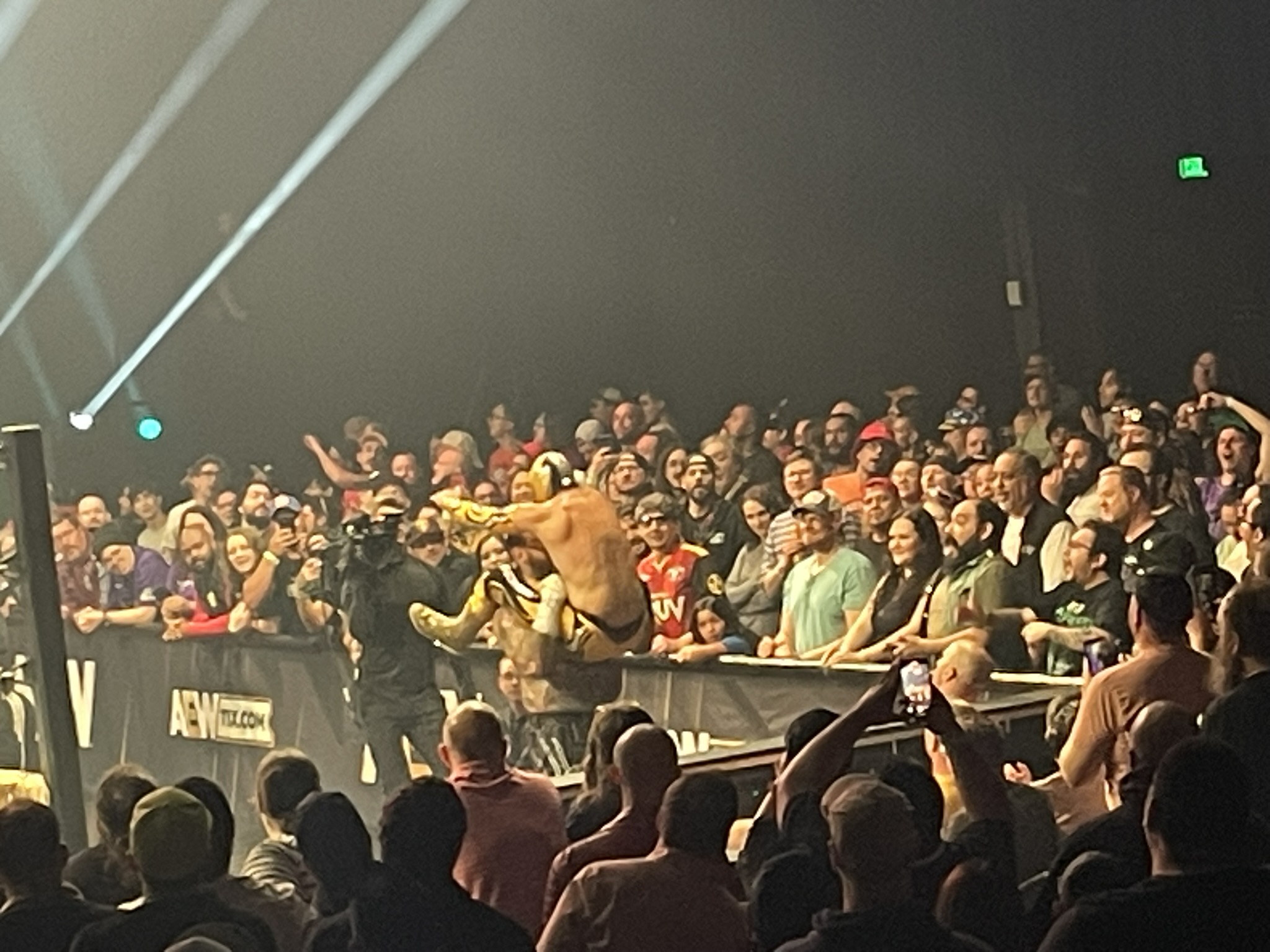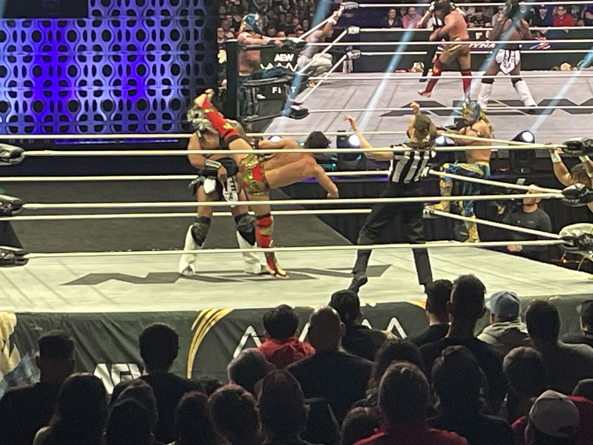The Mission Ballroom, as it turns out, is a sweet venue. Real good crowd too; didn't have to deal with obnoxious drunks saying fucked up shit about any of the minority wrestlers. Also: didn't see one fucking Jim Cornette sign, thank fuck. I figured I would be in good company when, during a pre-show video where Excalibur narrates disclaimers and codes of conduct, there was a huge roar of approval when he said that anyone who made bigoted comments would be ejected. Big pops when Komander and Hechicero spoke Spanish (Colorado has a huge Latino population). Toni Storm dancing with Mina Shirakawa got a reaction almost as loud as Omega having a face-off with Okada later in the night.