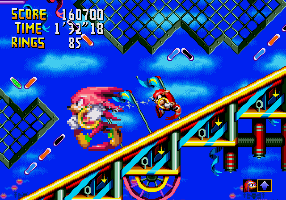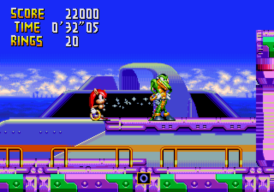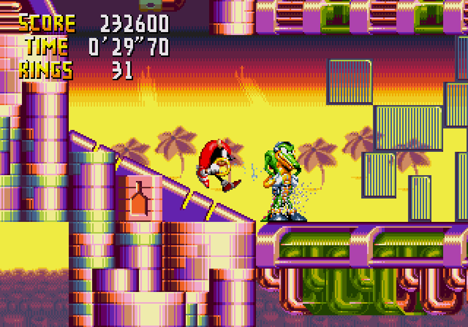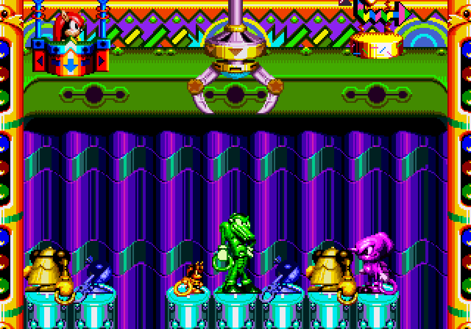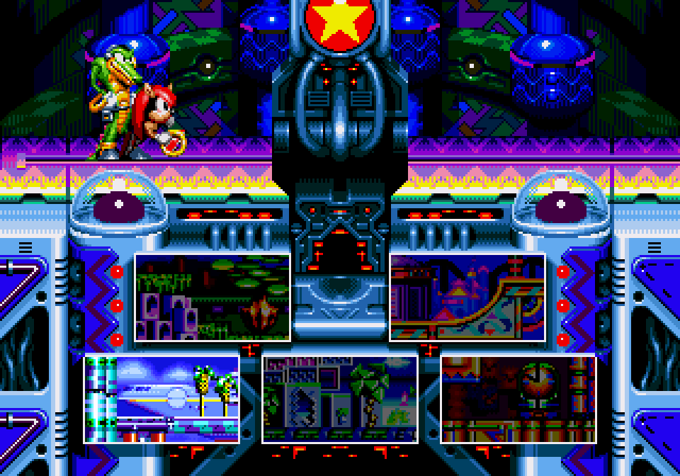 As someone who has a tremendous love for retro games, and is willing to try and find some positives in games that are otherwise terrible, I need to say this: the Sega 32X was an abomination. A physical representation of corporate mismanagement, ego, and greed that permanently altered the course of an entire company, and almost certainly cost some people jobs that they didn't need to lose. The best game on the system could best be described as "decent" or "oh hey, a good port of Space Harrier." Of course, as a kid, I wanted one really bad. I wanted a 32X for the same reason I wanted a Sega CD: because it had a Sonic game. To the shock of nobody, I was a Sega kid who was obsessed with Sonic the Hedgehog. I never did get those add-ons, my parents refused to get them for me, which I guess means my childhood wasn't that bad, as I ended up dodging a couple of bullets there. I wanted to write about Knuckles' Chaotix because, for whatever reason, my YouTube recommendations have had multiple videos on Chaotix being this underappreciated classic. I suppose this is better than my normal recommendations, which are either nine hour "essays" about some fucker I don't care about that 4chan spent a week making fun of in 2004, or videos like "[ASMR] Sex Doctor Touches Your Penis." There's been a bit of a critical reevaluation of the game in recent years, you've probably even heard it being referred to as "The Thinking Man's Sonic," a term that has been a 5 year long running in-joke in my friend group. In any case, I felt compelled to talk about Knuckles' Chaotix, if for no reason than because these videos are wrong.Knuckles' Chaotix is not a good game. I would recommend not playing it, assuming you're the opposite of me and you haven't already emulated the game, because you are checking out Sega games decades later the way I'm currently diving into Nintendo's stuff. You're not missing out on much. Now, it's not the worst Sonic game of the 16-bit era, that's firmly a tie between Sonic Spinball and Sonic 3D Blast, but it is a solid third worst. The thing about all this, is that Chaotix being bad is so fucking frustrating. You would think it's easy to say that a bad game on a worse console sucks and isn't worth your time, but it isn't. There are actually some good ideas in this game. There are mechanics in this game that, if they were expanded upon, could have let to something good, if not great. Knuckles' Chaotix is the kind of bad game where you can see small bits of potential buried under the malaise. A bit of background: Chaotix began life as a tech demo on the Sega Genesis, that was going to become a Saturn game, that then ran into issues during development. Because Sega had invested money in a technological abortion that sat on top of a system Tom Kalinske refused to let go of despite rapid advancements in game development, the decision was made to move Chaotix from the Saturn to the 32X, further scaling back an already troubled project. Playing the finished product, you can feel every last second of pain that those developers went through trying to put this thing together. Every setback, every word of "guidance" from the top, every resigned shrug from tired people who undoubtedly wanted to move on and forget that Knuckles Chaotix ever happened.As the title suggests, Knuckles' Chaotix is a spin-off of Sonic where you play as Knuckles the Echidna. Well, Knuckles and a new* group of friends called the Chaotix. Aside from that, the first thing that sets Chaotix apart from regular Sonic games is the fact that instead of running from left to right, you navigate from the bottom of a level to the top. In and of itself, a Sonic game where you move vertically is already pretty innovative. The way that those games use movement, the use of speed and momentum, now being used to move in a different direction. Imagine the use of loop-de-loops and ramps, now applied to aerial travel. It's such a simple concept, but in the right hands, it could be an amazing game. You've probably also noticed how there are two characters in these screenshots, both holding a ring. The stars between those rings acts as a tether, keeping you and a partner together. This magic tether can be used like a slingshot, with one character grounding themselves in place while the other pulls as far back as they can, before both go shooting off at, ahem, sonic speed. This is all sounds great, right? If nothing else, the use of physics in this game work extremely well. Which is too damn bad that the level design doesn't utilize this in any sort of meaningful way. Levels in Chaotix are long, empty shafts that never have any real gimmick beyond quarter-pipes and half-pipes leading from one platform to the next. Hardly any enemies, very little in the way of obstacles such as spikes, nothing. The biggest challenge is getting lost in a couple of levels, as the end of certain stages aren't signposting very well, so you can go in circles a few times until you realize the end of a stage is to the left instead of the right, or the right instead of the left. You have all these new, well made mechanics, and nothing to use them on. You can select your main character, but your partner has to be chosen through a claw machine mini-game, and your level progression is dictated by a roulette. Not sure why there was such an emphasis on randomization. I also need to point out two completely useless power-ups: one that makes your player character bigger and able to jump higher, and another one that makes them smaller and unable to jump more than an inch off the ground. They serve either little purpose, or are there as a major inconvenience. Just another example of more half-implemented ideas in the game.Knuckles' Chaotix is the worst kind of bad a game like this could be: boring. An empty, lifeless game that goes on for twenty five levels. It's a shame. A shame that something with all this potential never sees that potential realized. A shame that something that obviou
