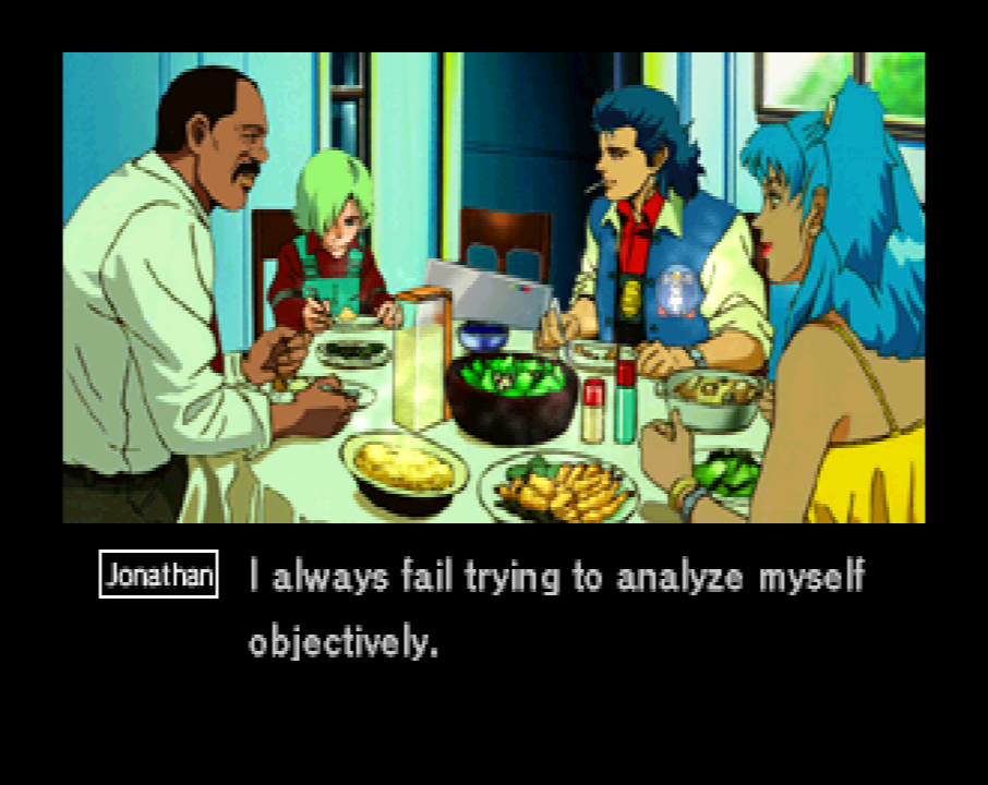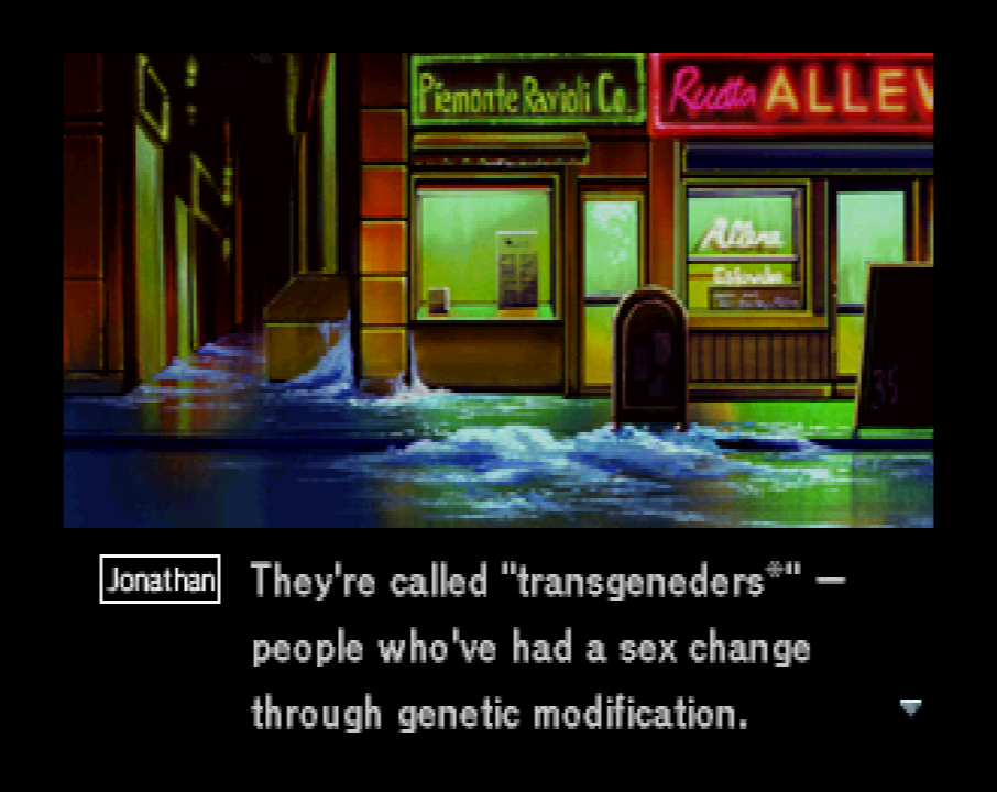 This game was the main reason why I felt like opening up Mednafen and messing around with Saturn stuff. Policenauts is one of those games I've wanted to like for so long, then I played the fan translation, and found myself hating it pretty quick. Pretty much all stemming from a small scene at the beginning of the game where the private eye main character, Johnathan, is commissioned by his ex-wife to find her missing husband. After telling her that he'll think about it, she leaves, and then is immediately killed by a car bomb. Johnathan sees the killer, and gets into a chase/gunfight with the guy. After the first shootout, you have to search the street to see where he ran off to. One of the places you can look at is a strip club across from Johnathan's office, which is full of "Biovestites," people who have gotten sex changes via genetic manipulation. "This city's full of 'em, unfortunately."