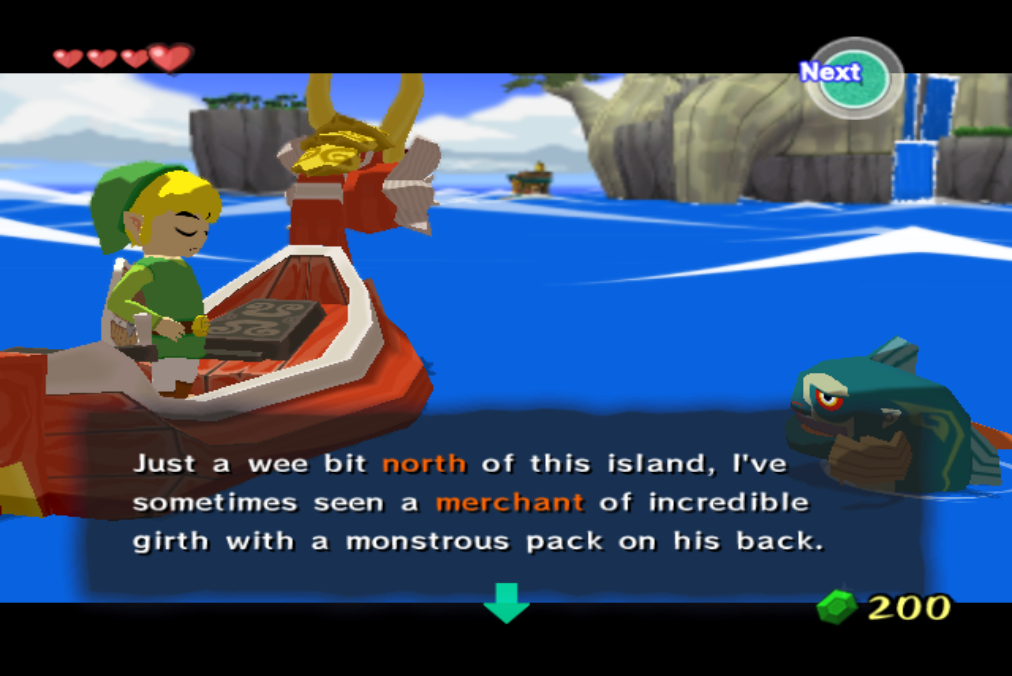 See, if you're like me, and haven't played Wind Waker until now, the land of Hyrule is broken up into a series of small islands separated by a large ocean. After finishing the first dungeon, Link gets access to a sentient raft named The King of Red Lions, which serves as the primary mode of transportation. So the focus of the game is sailing. Sailing from dungeon to dungeon. Sailing to the few towns that exist. Sailing to every hidden, out of the way curiosity. Sailing to find hidden treasure. Lots and lots of sailing. Lots of long periods of sailing on the open waters, only occasionally dealing with danger. A lot of players found this to be boring; long periods of inactivity between all the things that make up a Zelda game.